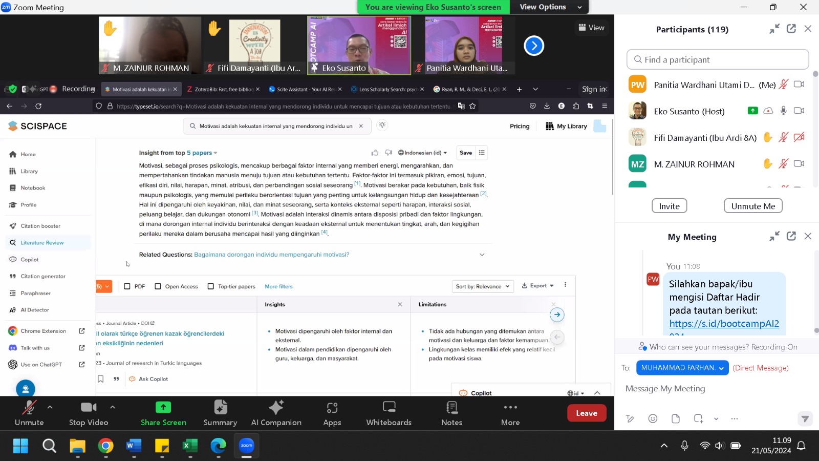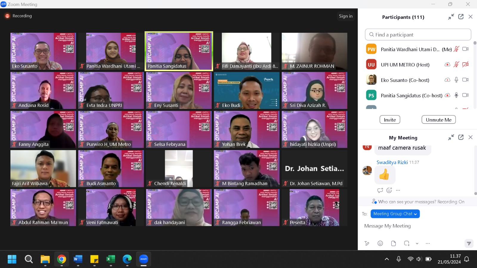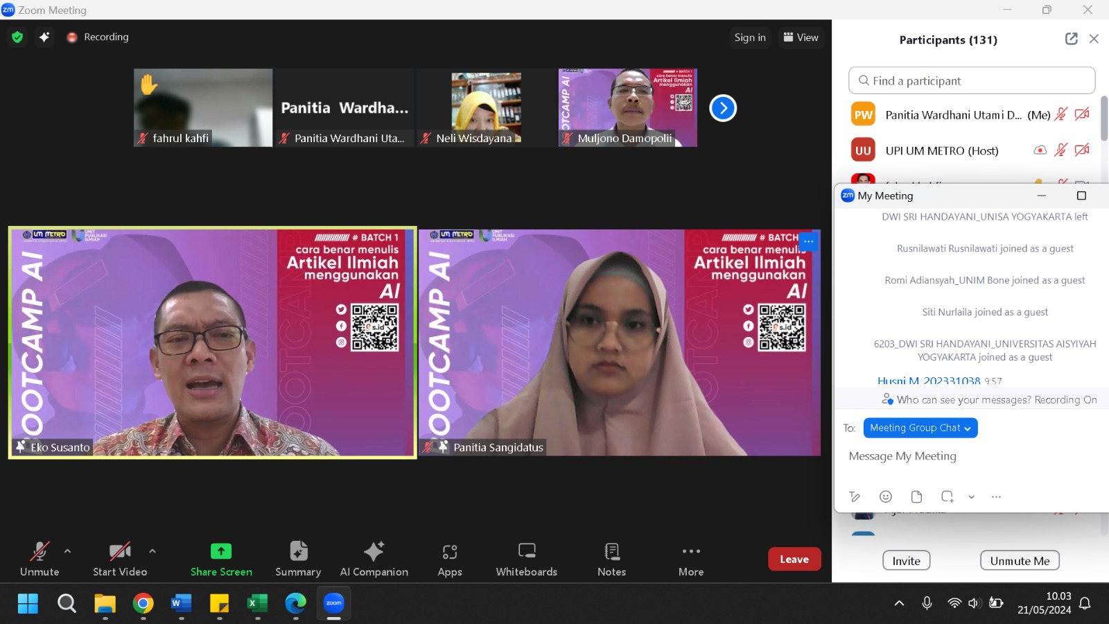 21 Mei 2024 | Unit Publikasi Ilmiah Universitas Muhammadiyah Metro sukses menggelar kegiatan Bootcamp AI Batch 1 dengan tema "Cara Benar Menulis Artikel dengan AI". Kegiatan yang diadakan secara daring melalui platform Zoom Meeting tersebut menjadi sorotan utama bagi para peneliti, akademisi, dan praktisi di berbagai daerah, mulai dari Sabang hingga Merauke.