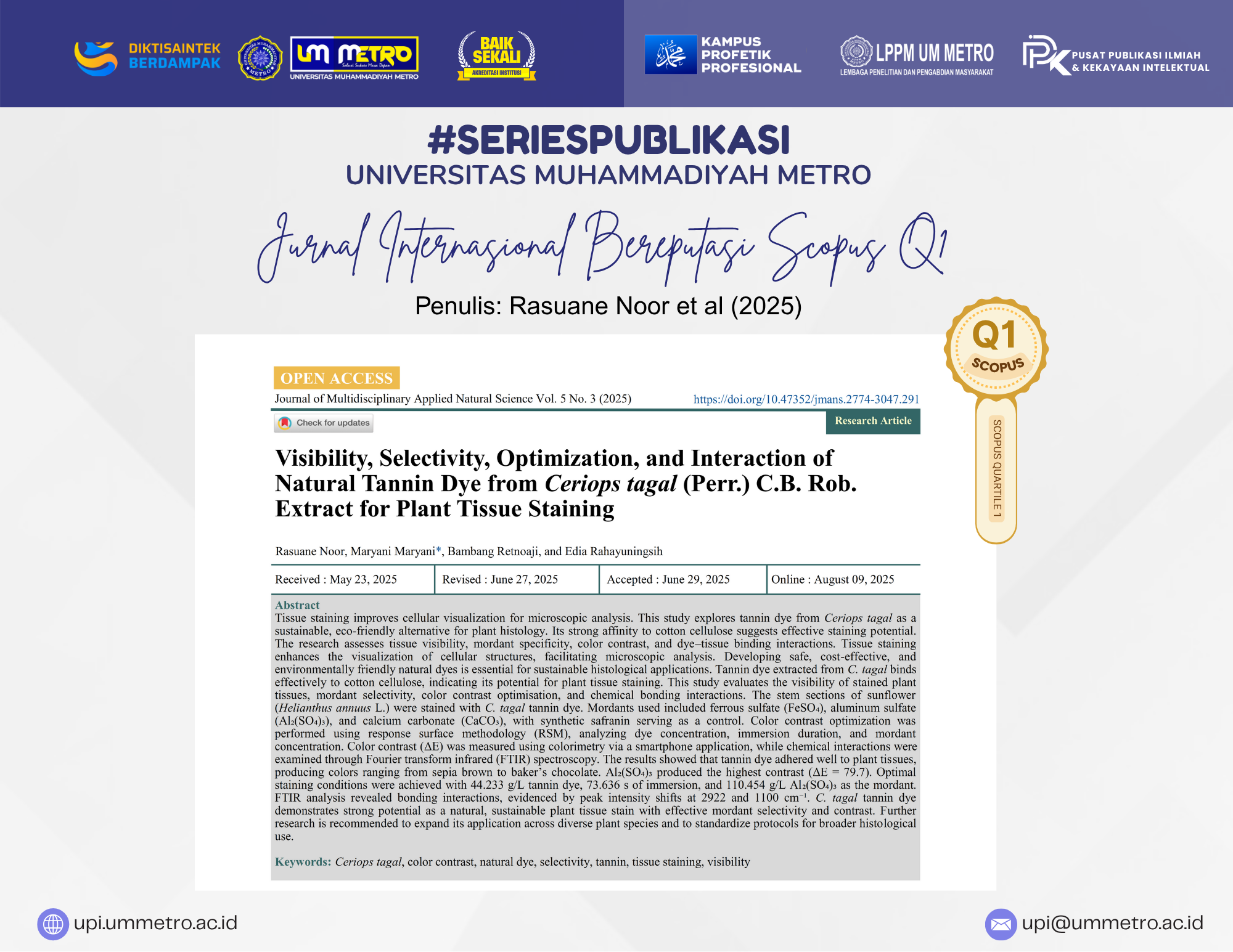 Dosen Universitas Muhammadiyah Metro (UM Metro), Rasuane Noor, M.Sc., dari Program Studi S1 Pendidikan Biologi, bersama tim kolaboratornya, kembali menorehkan prestasi membanggakan di kancah internasional. Ia berhasil menerbitkan artikel ilmiah berjudul “Visibility, Selectivity, Optimization, and Interaction of Natural Tannin Dye from Ceriops tagal (Perr.) C.B. Rob. Extract for Plant Tissue Staining” di Journal of Multidisciplinary Applied Natural Science (Vol. 5 No. 3, 2025) yang terindeks Scopus Q1.