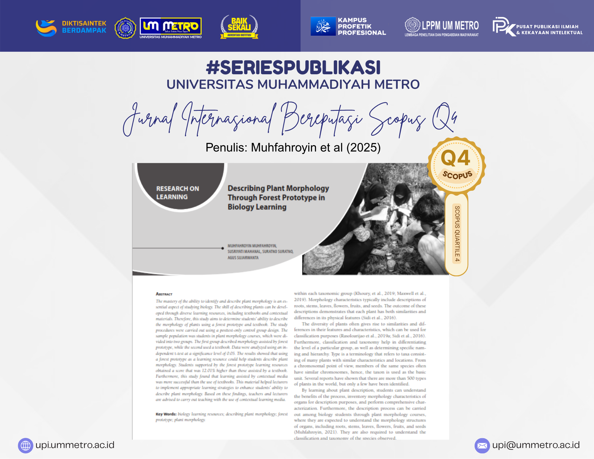 Dosen Program Studi S2 Pendidikan Biologi Universitas Muhammadiyah Metro (UM Metro), yang dipimpin oleh Bapak Prof. Dr. Muhfahroyin, M.T.A berkolaborasi dengan Ibu Susriyati Mahanal, Bapak Suratno dan Bapak Dr. Agus Sujarwanta, M.Pd. berhasil menerbitkan artikel berjudul "Describing Plant Morphology Through Forest Prototype in Biology Learning" di jurnal internasional terindeks Scopus Q4.