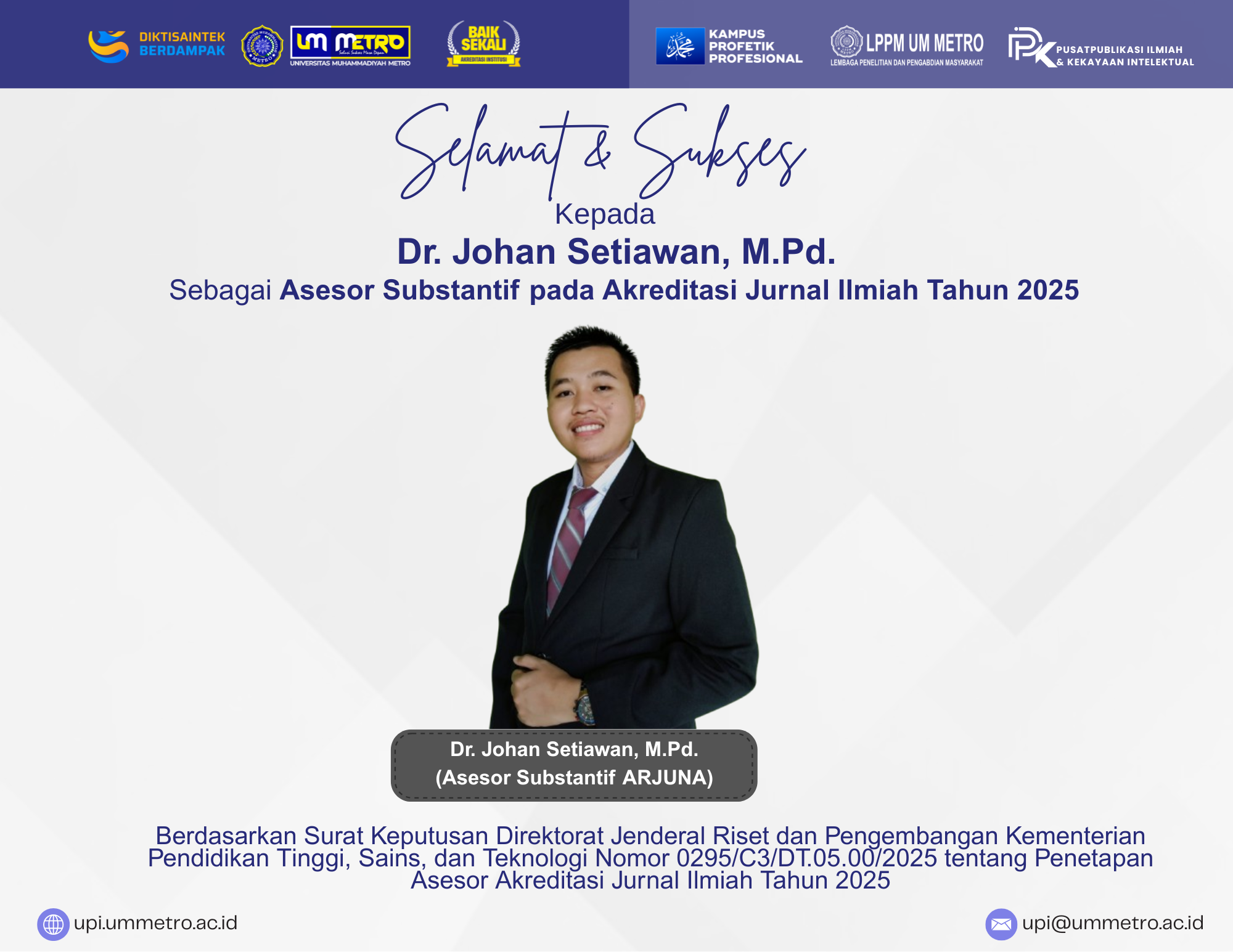 Universitas Muhammadiyah Metro kembali menorehkan prestasi membanggakan di tingkat nasional. Salah satu dosen terbaiknya, Dr. Johan Setiawan, M.Pd., ditetapkan sebagai Asesor Substantif pada Akreditasi Jurnal Ilmiah Tahun 2025 berdasarkan Surat Keputusan Direktorat Jenderal Riset dan Pengembangan Kementerian Pendidikan Tinggi, Sains, dan Teknologi Nomor 0295/C3/DT.05.00/2025.