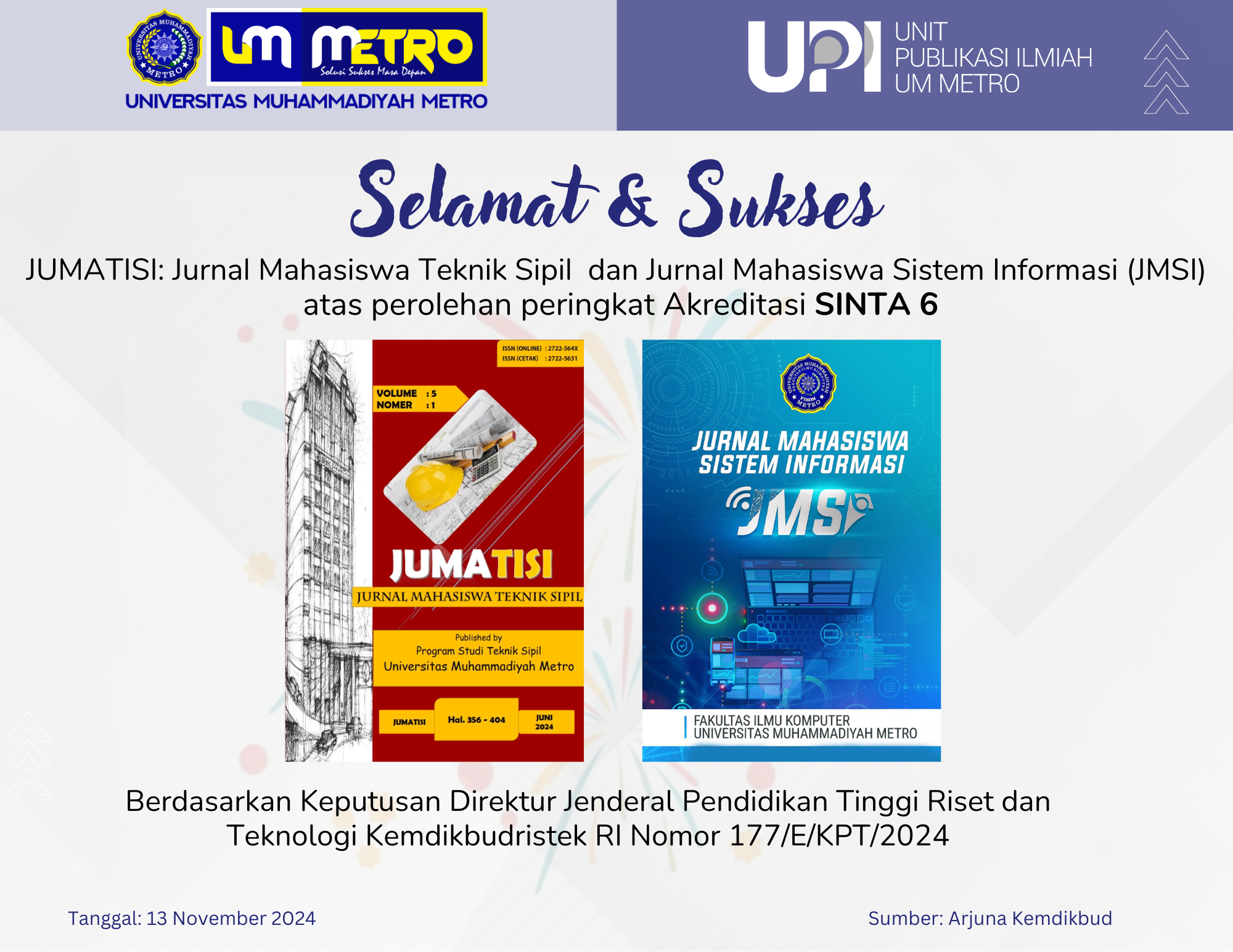 Metro, 13 November 2024 — Universitas Muhammadiyah Metro kembali mencatatkan prestasi membanggakan dalam dunia publikasi ilmiah. Dua jurnal mahasiswa, yaitu JUMATISI (Jurnal Mahasiswa Teknik Sipil) dan JMSI (Jurnal Mahasiswa Sistem Informasi), resmi memperoleh peringkat Akreditasi SINTA 6. Pengakuan ini berdasarkan Keputusan Direktur Jenderal Pendidikan Tinggi Riset dan Teknologi Kemdikbudristek RI Nomor 177/E/KPT/2024.