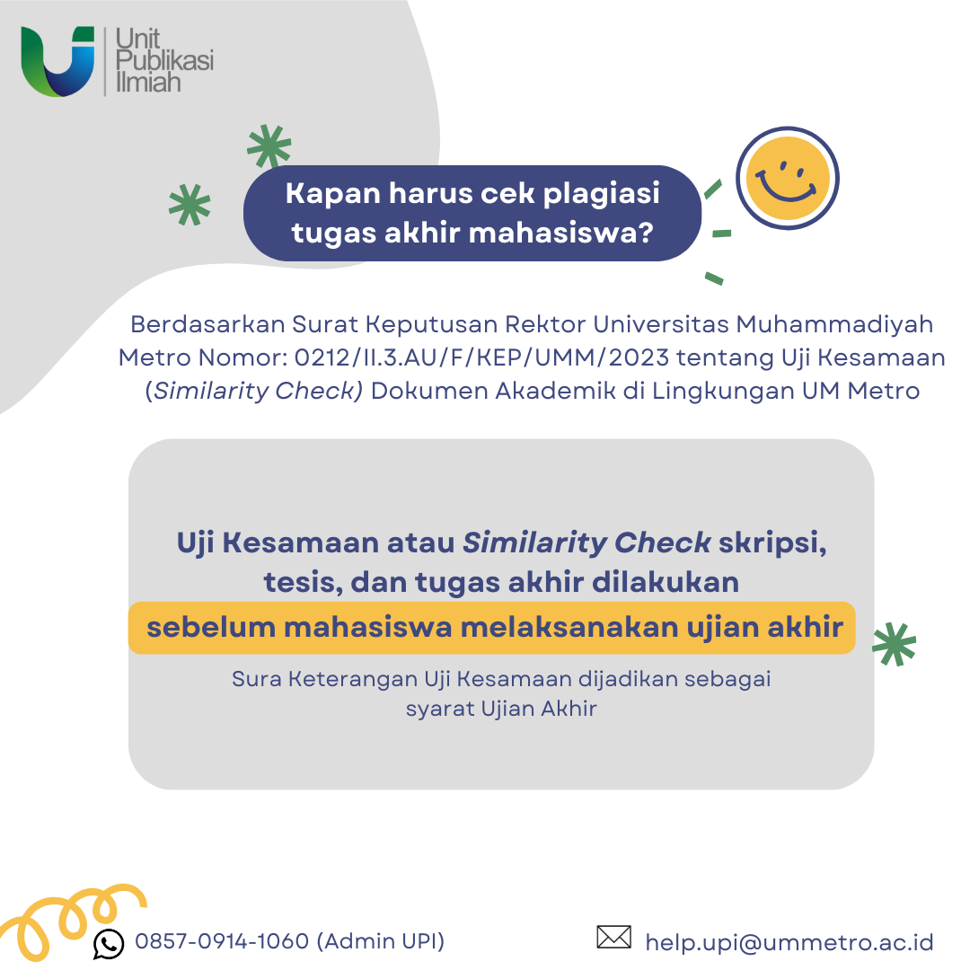 Berdasarkan Surat Keputusan Rektor Universitas Muhammadiyah Metro Nomor: 0212/II.3.AU/F/KEP/UMM/2023, semua skripsi, tesis, dan tugas akhir wajib melalui Uji Kesamaan (Similarity Check) sebelum melaksanakan ujian akhir.