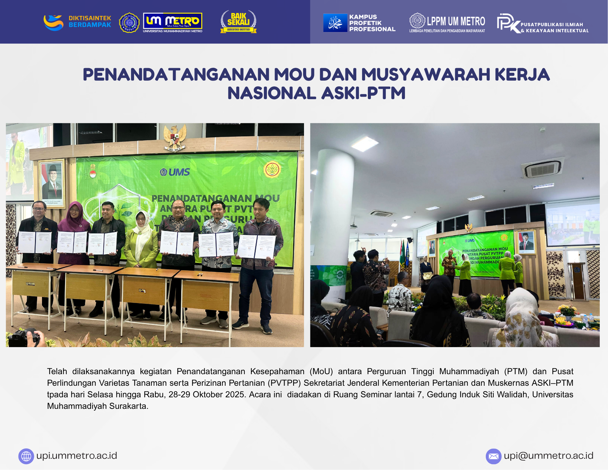 Universitas Muhammadiyah Metro (UM Metro) turut berperan aktif dalam pengembangan riset pertanian melalui partisipasinya dalam Penandatanganan MoU antara Perguruan Tinggi Muhammadiyah (PTM) dan Pusat Perlindungan Varietas Tanaman dan Perizinan Pertanian (PVTPP) Sekretariat Jenderal Kementerian Pertanian. Acara yang berlangsung pada 28-29 Oktober 2025 di Universitas Muhammadiyah Surakarta ini juga menjadi ajang bagi musyawarah kerja nasional (Muskernas) ASKI-PTM yang membahas berbagai inovasi dan kebijakan terkait kekayaan intelektual di perguruan tinggi Muhammadiyah.