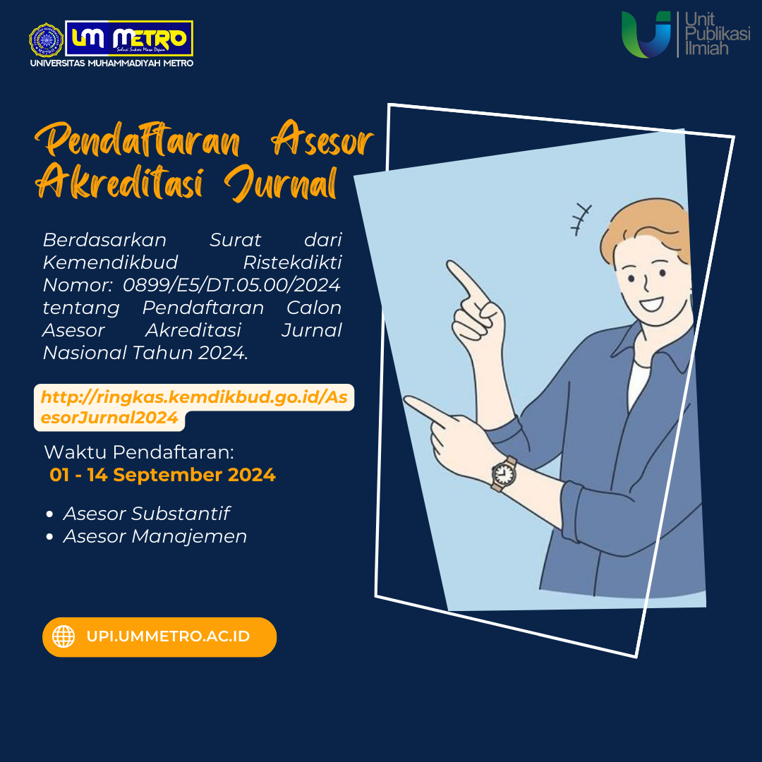 Menindaklanjuti Surat dari Kemendikbud Ristekdikti Nomor : 0899/E5/DT.05.00/2024 perihal Pendaftaran Asesor Akreditasi Jurnal Ilmiah Tahun 2024. Bagi Bapak/Ibu dosen Universitas Muhammadiyah Metro yang berminat mendaftar sebagai Asesor Akreditasi Jurnal Ilmiah dipersilahkan. Pendaftaran Calon Asesor Akreditasi Jurnal Ilmiah dibuka pada tanggal 1 sampai dengan 14 September 2024 dan borang serta panduan Pendaftaran Asesor Akreditasi Jurnal Ilmiah tahun 2024 dapat diakses pada http://ringkas.kemdikbud.go.id/AsesorJurnal2024.
