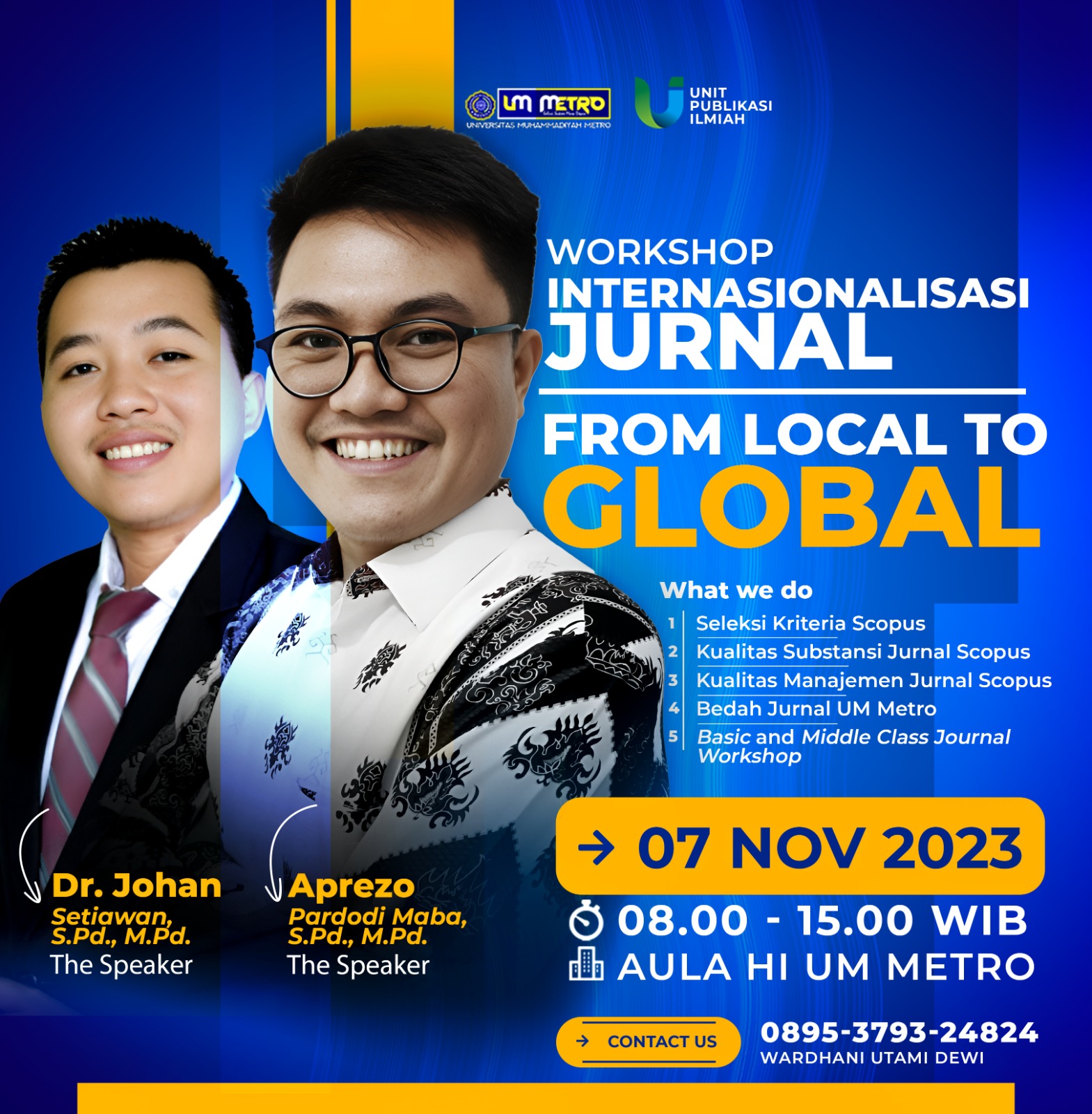 Universitas Muhammadiyah (UM) Metro melalui Unit Publikasi Ilmiah akan menyelenggarakan workshop bertajuk "Internasionalisasi Jurnal: From Local to Global" pada tanggal 7 November 2023. Acara ini akan berlangsung dari pukul 08.00 hingga 15.00 WIB di Aula HI UM Metro.