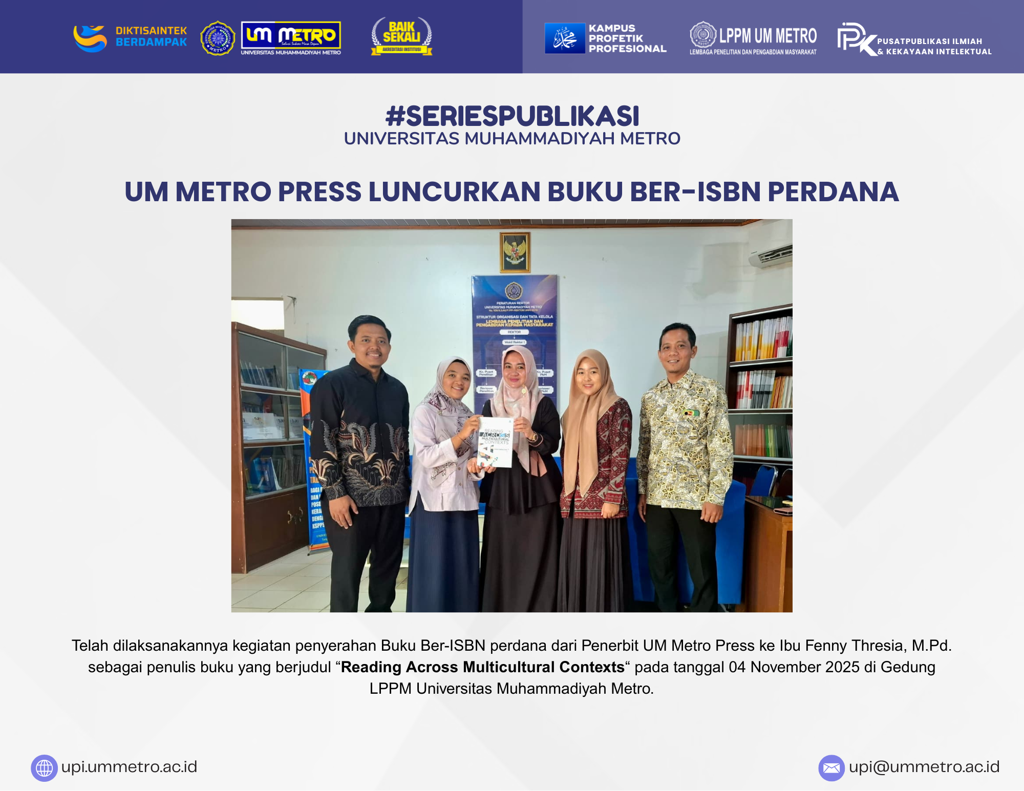 Universitas Muhammadiyah Metro melalui UM Metro Press resmi meluncurkan buku ber-ISBN perdana yang ditulis oleh Fenny Thresia, M.Pd. dengan judul Reading Across Multicultural Contexts. Kegiatan penyerahan buku secara simbolis dilaksanakan pada Selasa, 4 November 2025, bertempat di Gedung LPPM Universitas Muhammadiyah Metro.